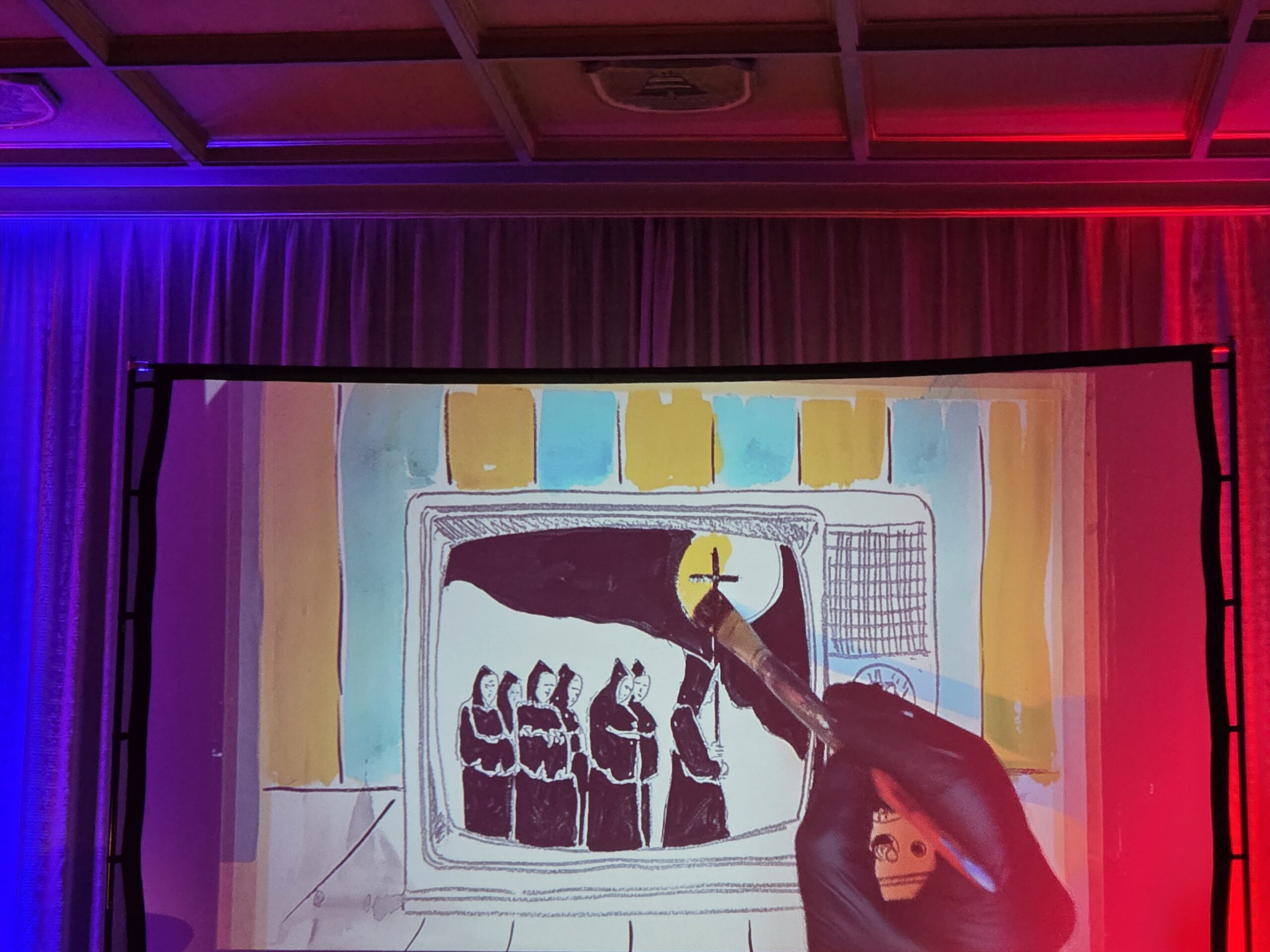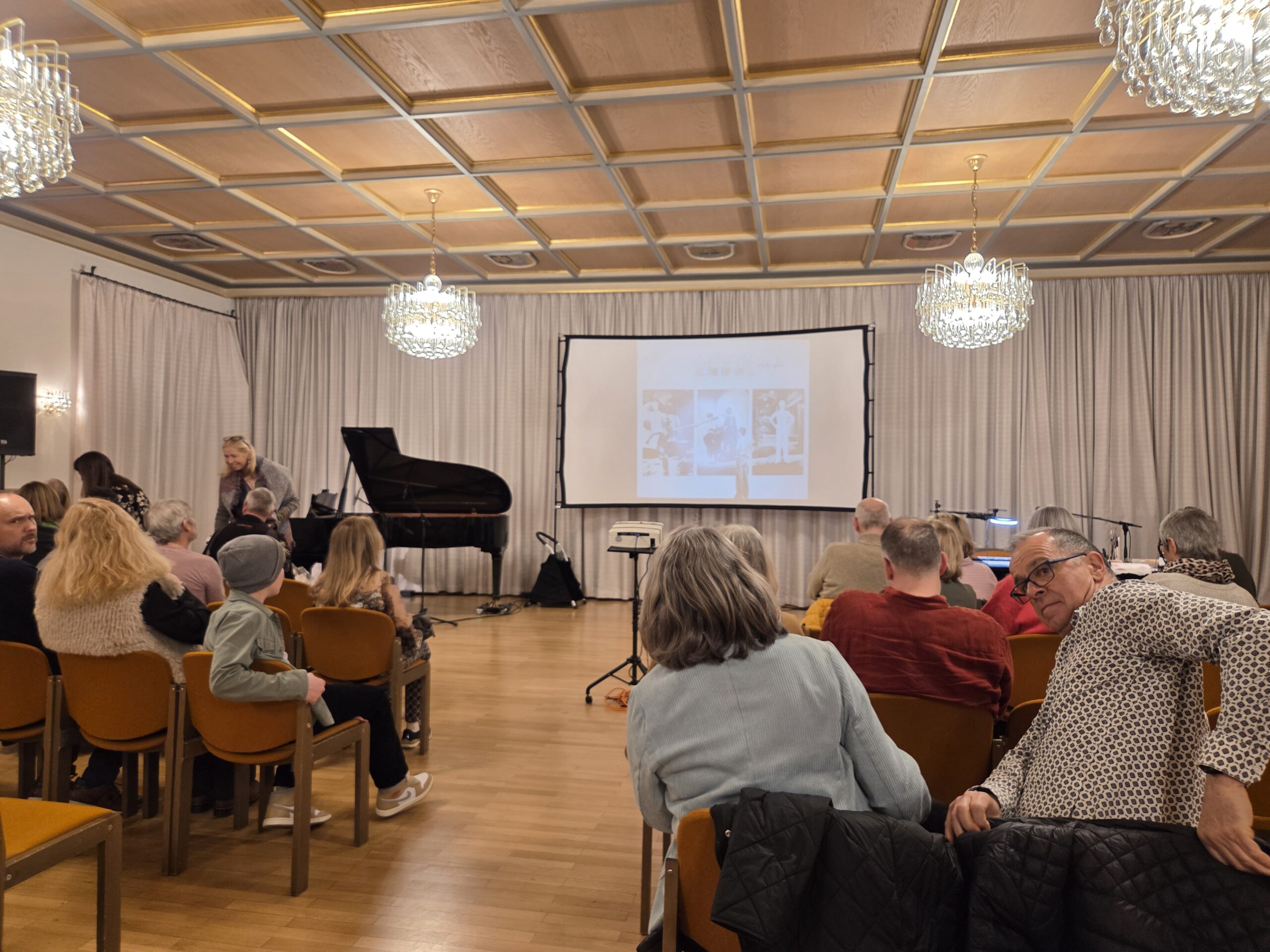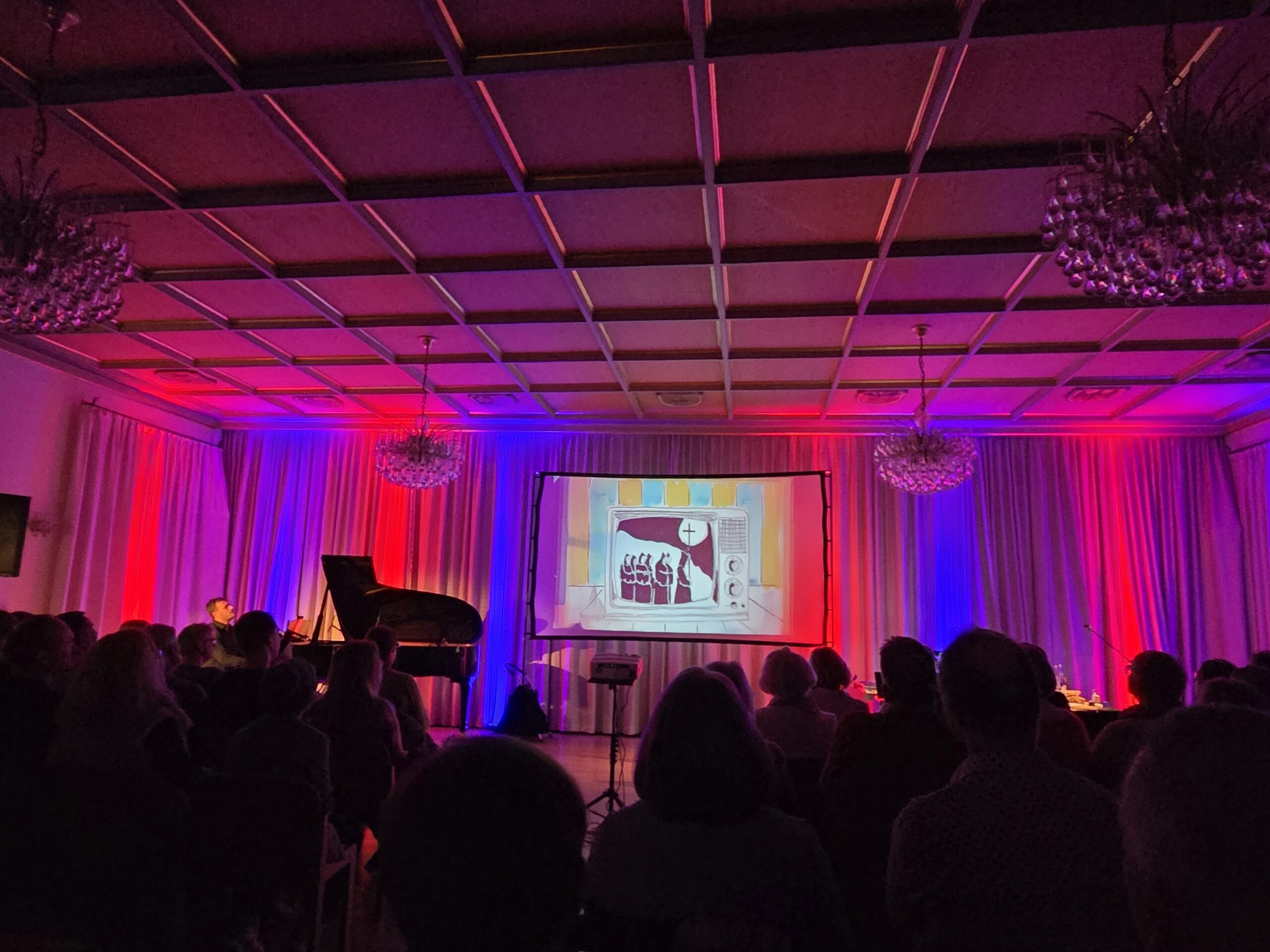 Aber zu meinem persönlichen Eindruck dieses multimedialen Abends. Als Location diente der „Silvestersaal“, einem stilvollen fast schon gemütlichen Saal für etwa 100 Besucher. Dieser liegt etwas versteckt in der Mindelheimer Innenstadt. Ganzjährig finden hier Konzerte, Lesungen, kleine Theateraufführungen und weitere Festlichkeiten statt. Der Saal befindet sich in der äußerlich eher unscheinbaren Silvesterkirche, die im Zuge der Säkularisation im Jahr 1804 geschlossen wurde. Ein reizvoller Raum und Rahmen für dieses besondere Event.