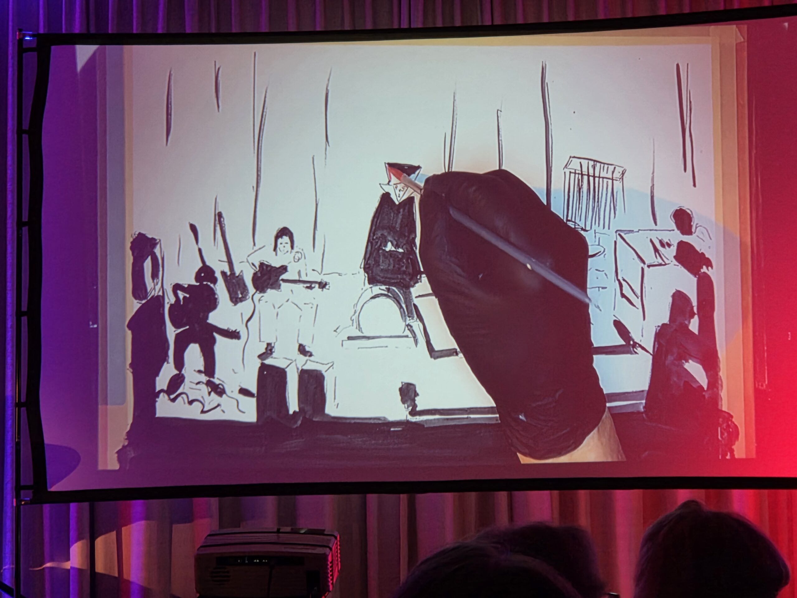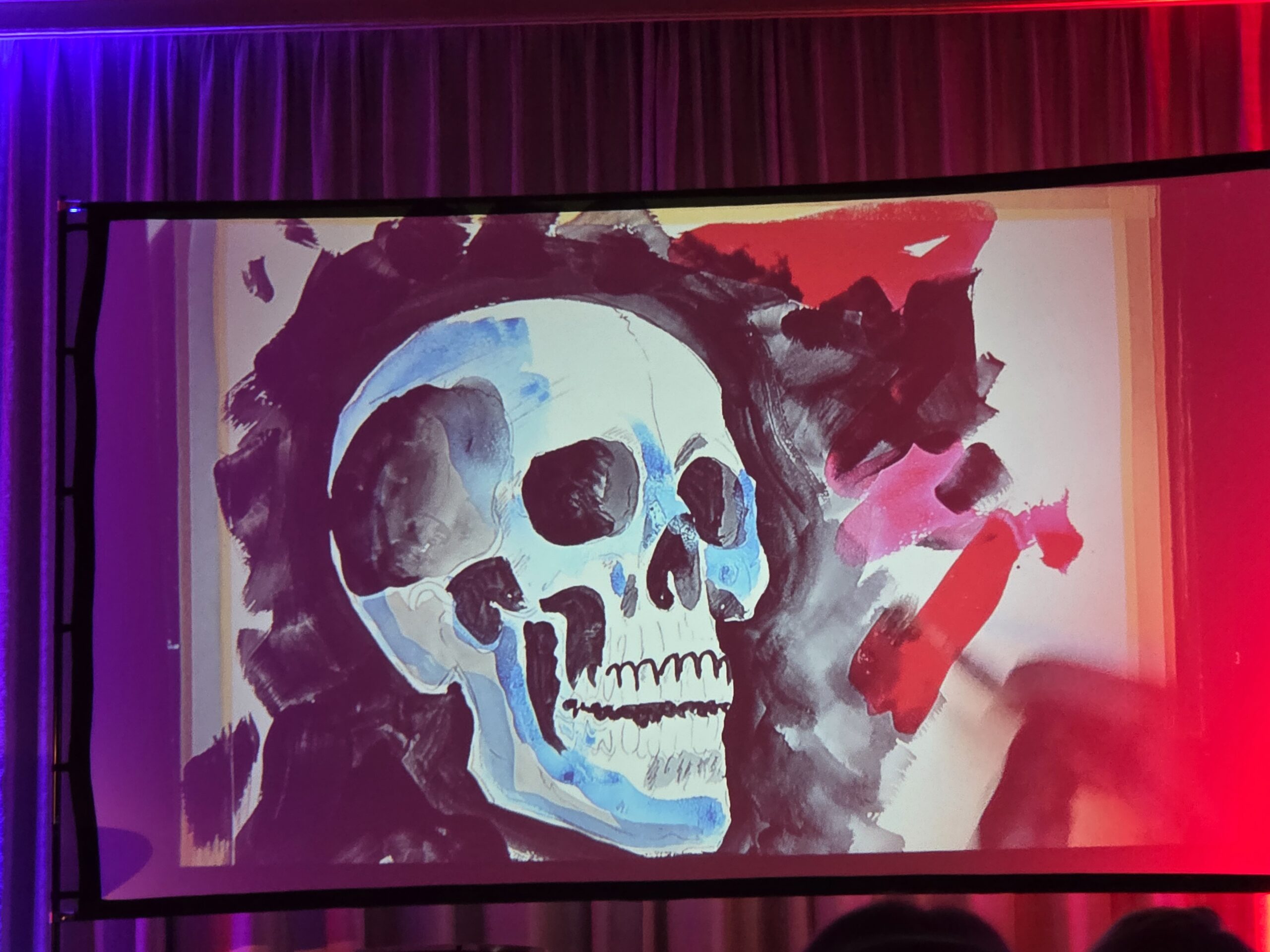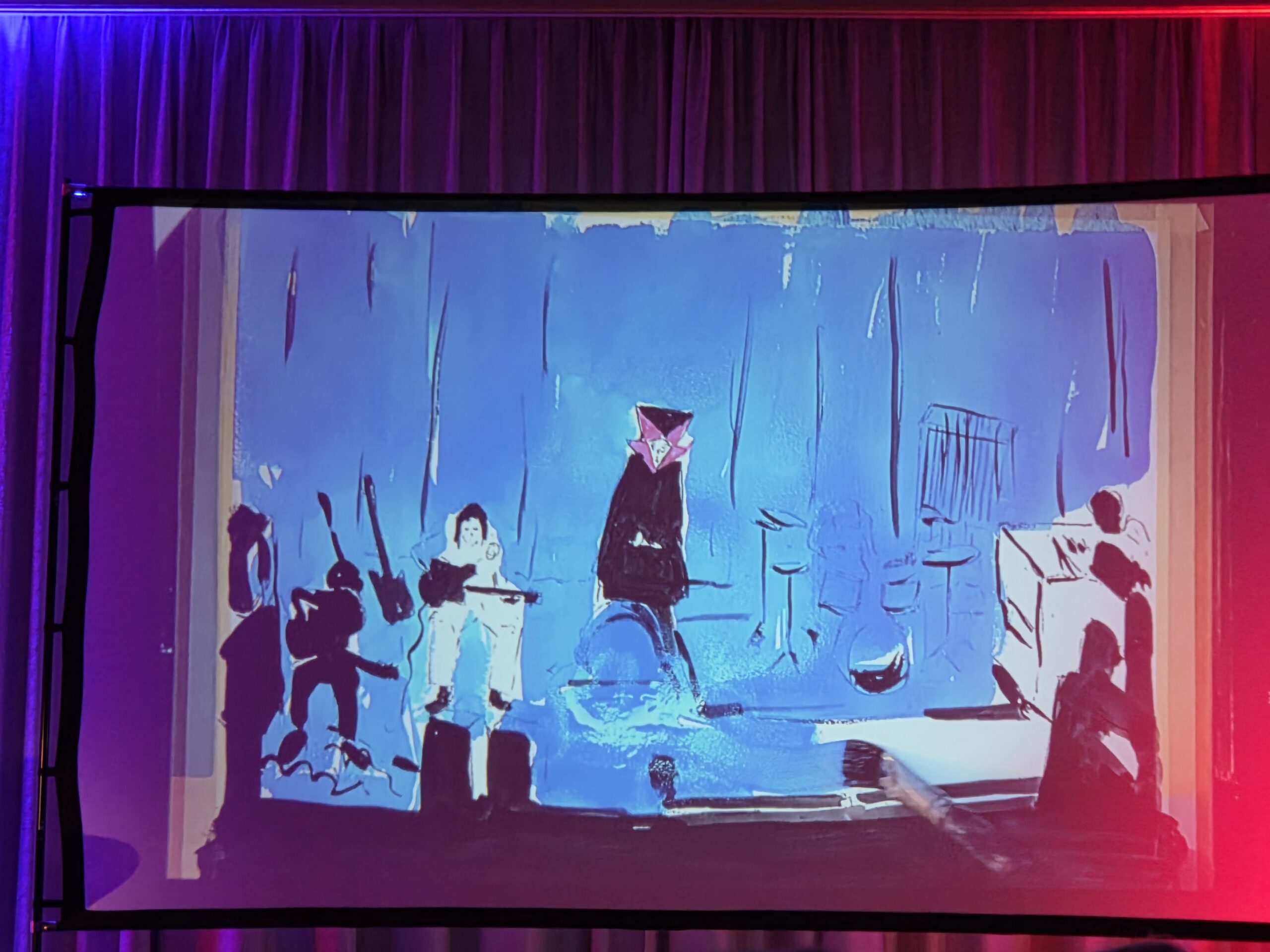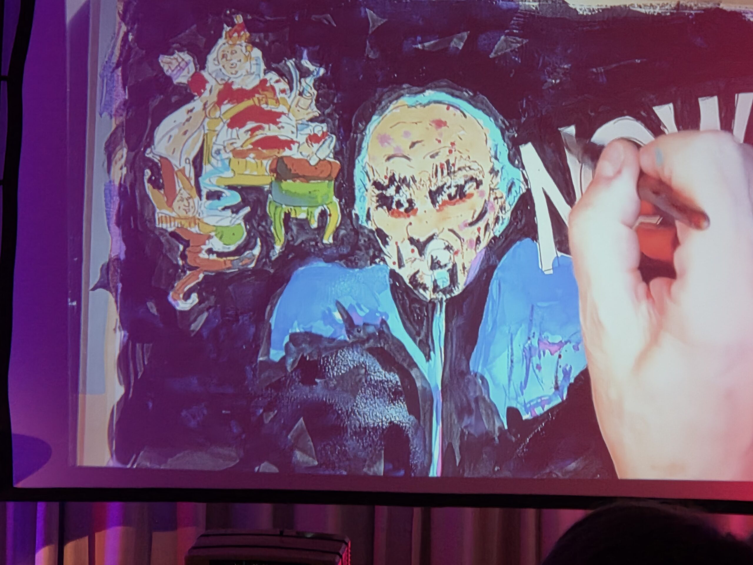 Pünktlich um 20.00 Uhr begann die Veranstaltung. Der erste Teil des Abends bestand komplett aus „The Lamb lies down…“ Ich glaube für manche Besucher klang diese Interpretation etwas ungewöhnlich, obwohl ich sämtliche Melodien gut heraushören konnte. Allerdings bin ich mit diesem Werk von Genesis mehr als vertraut. Mir fiel auf das nach der Pause einige Plätze nicht mehr besetzt waren, was ich sehr schade fand. Besonders beeindruckte mich die Entstehung der Bilder die simultan zu den einzelnen Stücken gemalt wurden, so etwas hatte ich in dieser Form noch nicht gesehen und war völlig neu für mich.