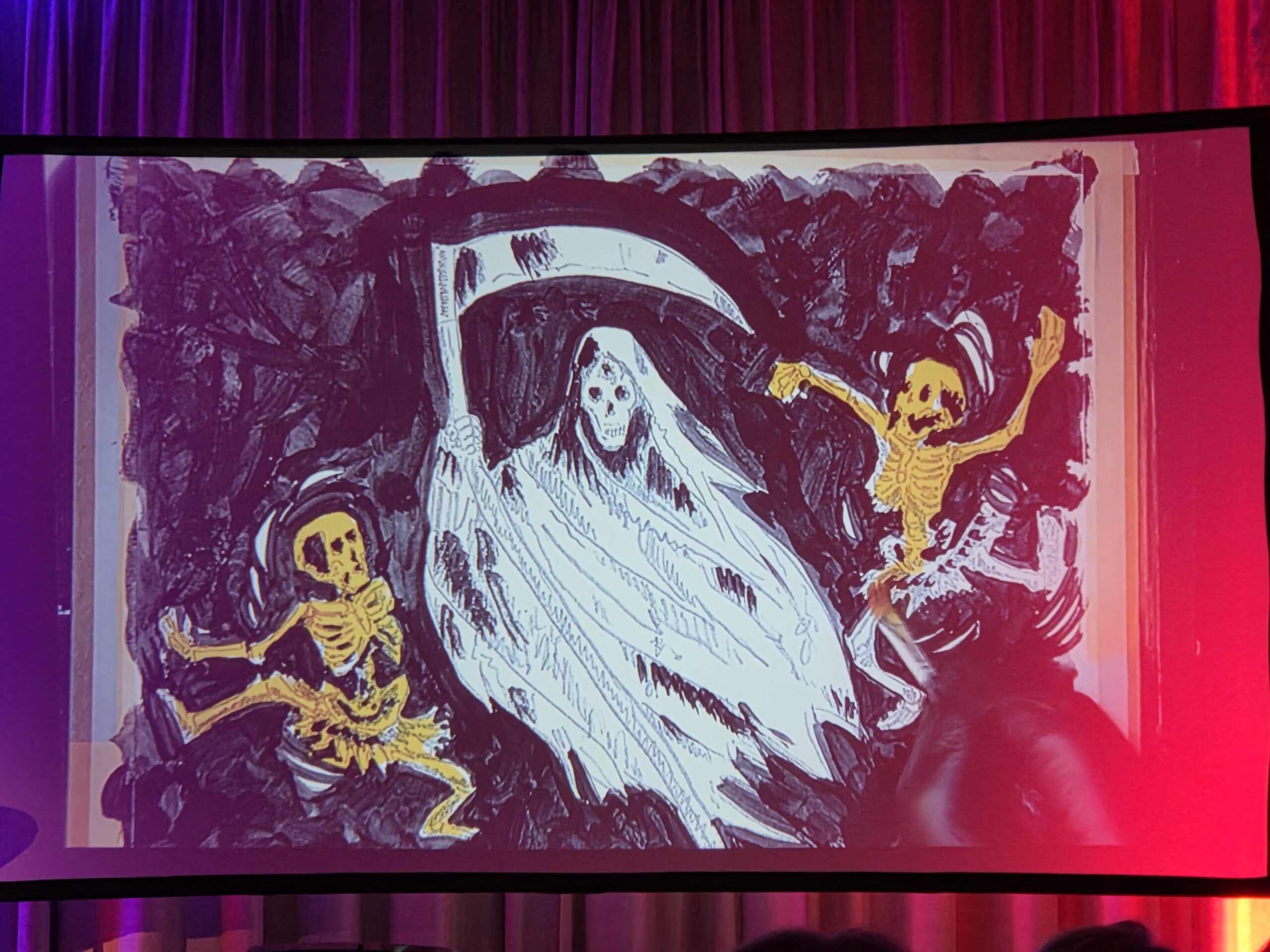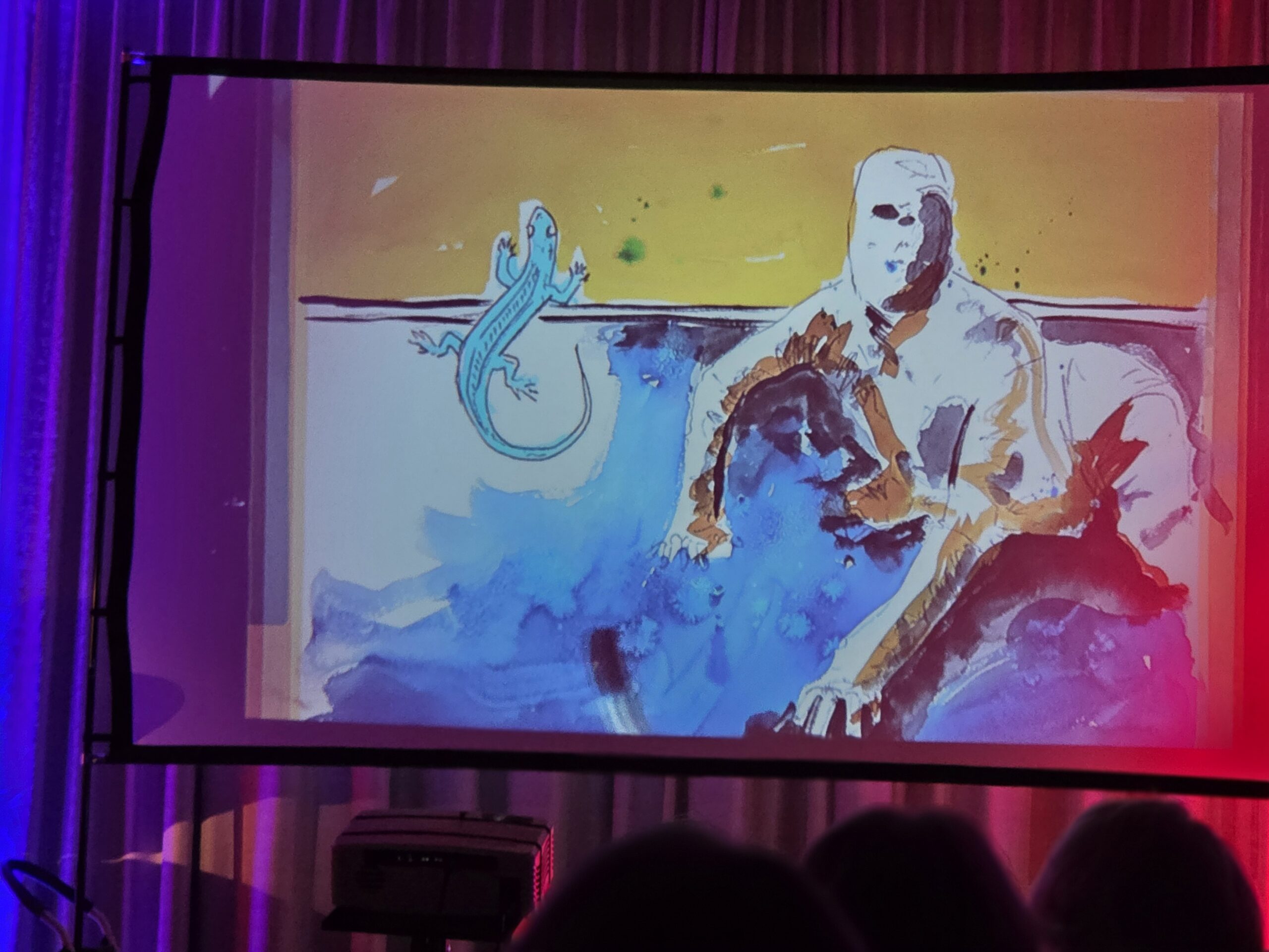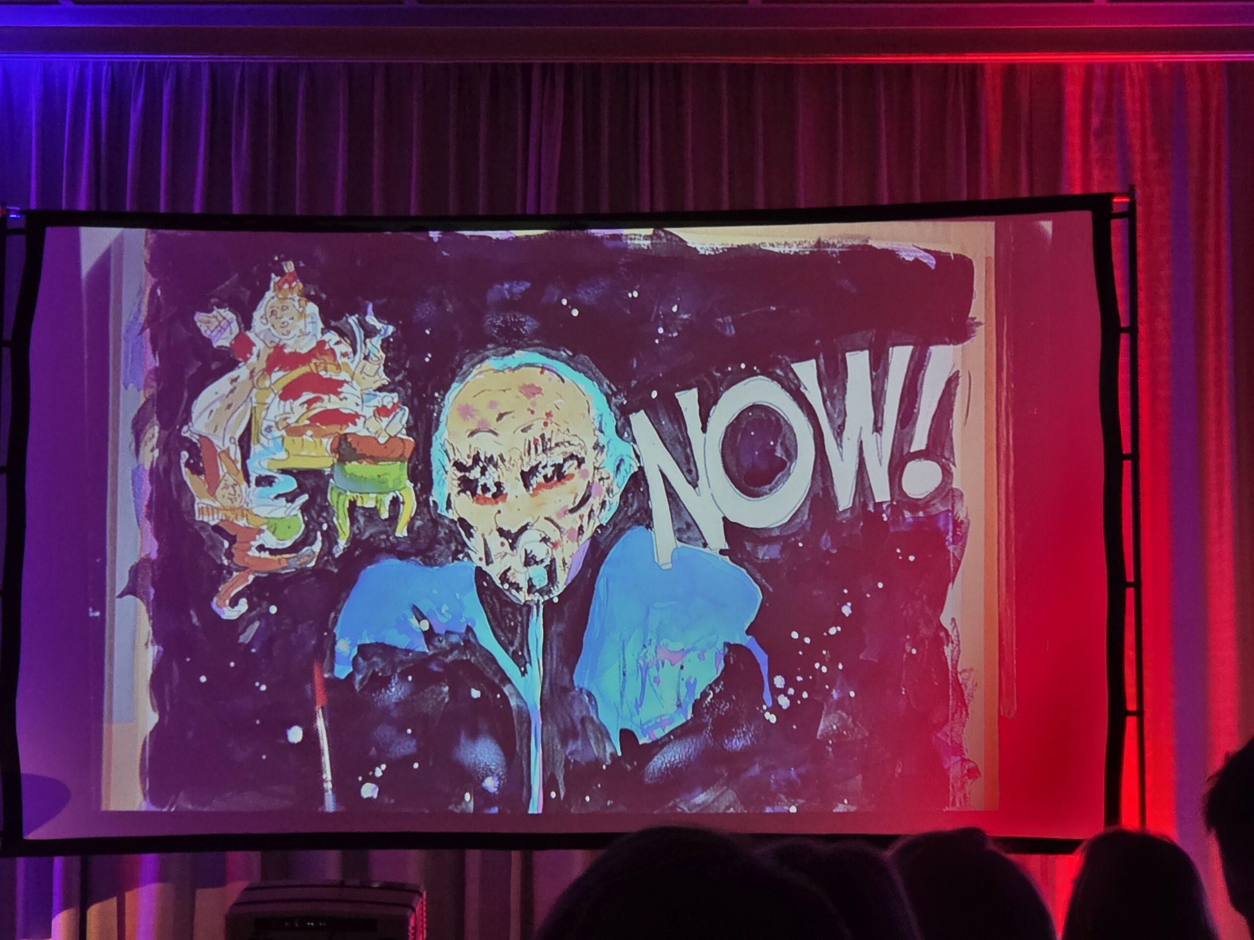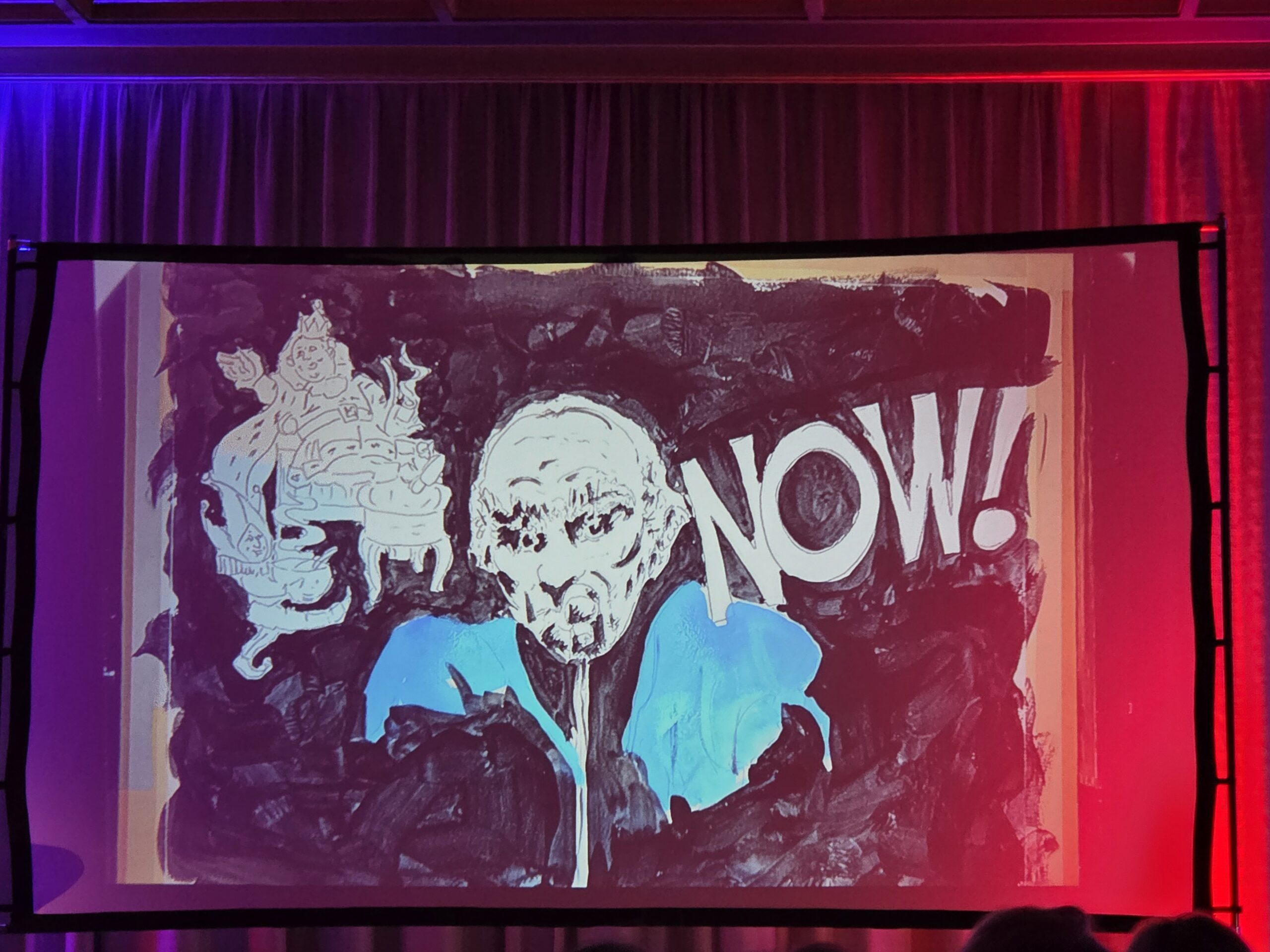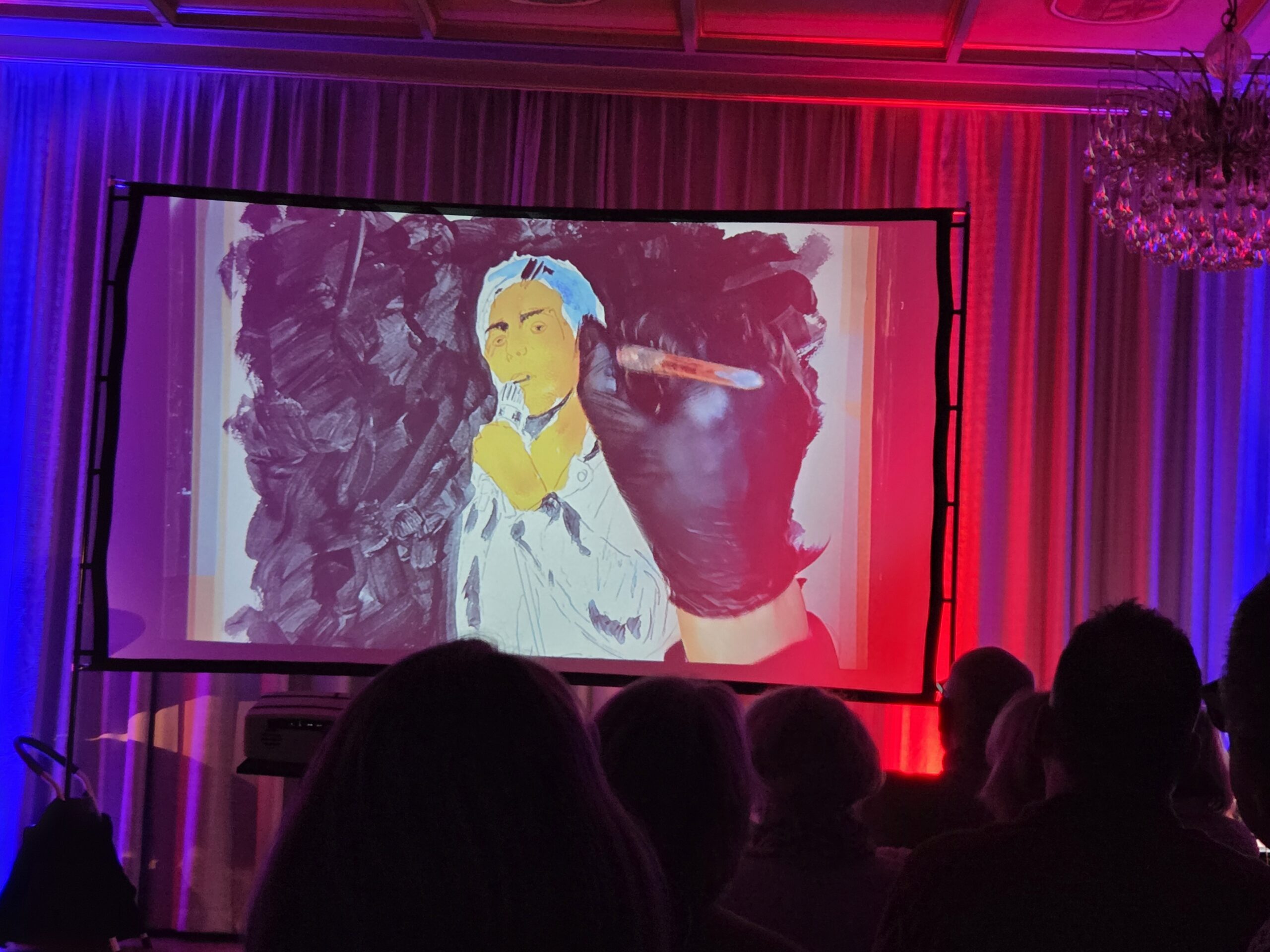Pünktlich um 20.00 Uhr begann die Veranstaltung. Der erste Teil des Abends bestand komplett aus „The Lamb lies down…“ Ich glaube für manche Besucher klang diese Interpretation etwas ungewöhnlich, obwohl ich sämtliche Melodien gut heraushören konnte. Allerdings bin ich mit diesem Werk von Genesis mehr als vertraut. Mir fiel auf das nach der Pause einige Plätze nicht mehr besetzt waren, was ich sehr schade fand. Besonders beeindruckte mich die Entstehung der Bilder die simultan zu den einzelnen Stücken gemalt wurden, so etwas hatte ich in dieser Form noch nicht gesehen und war völlig neu für mich.